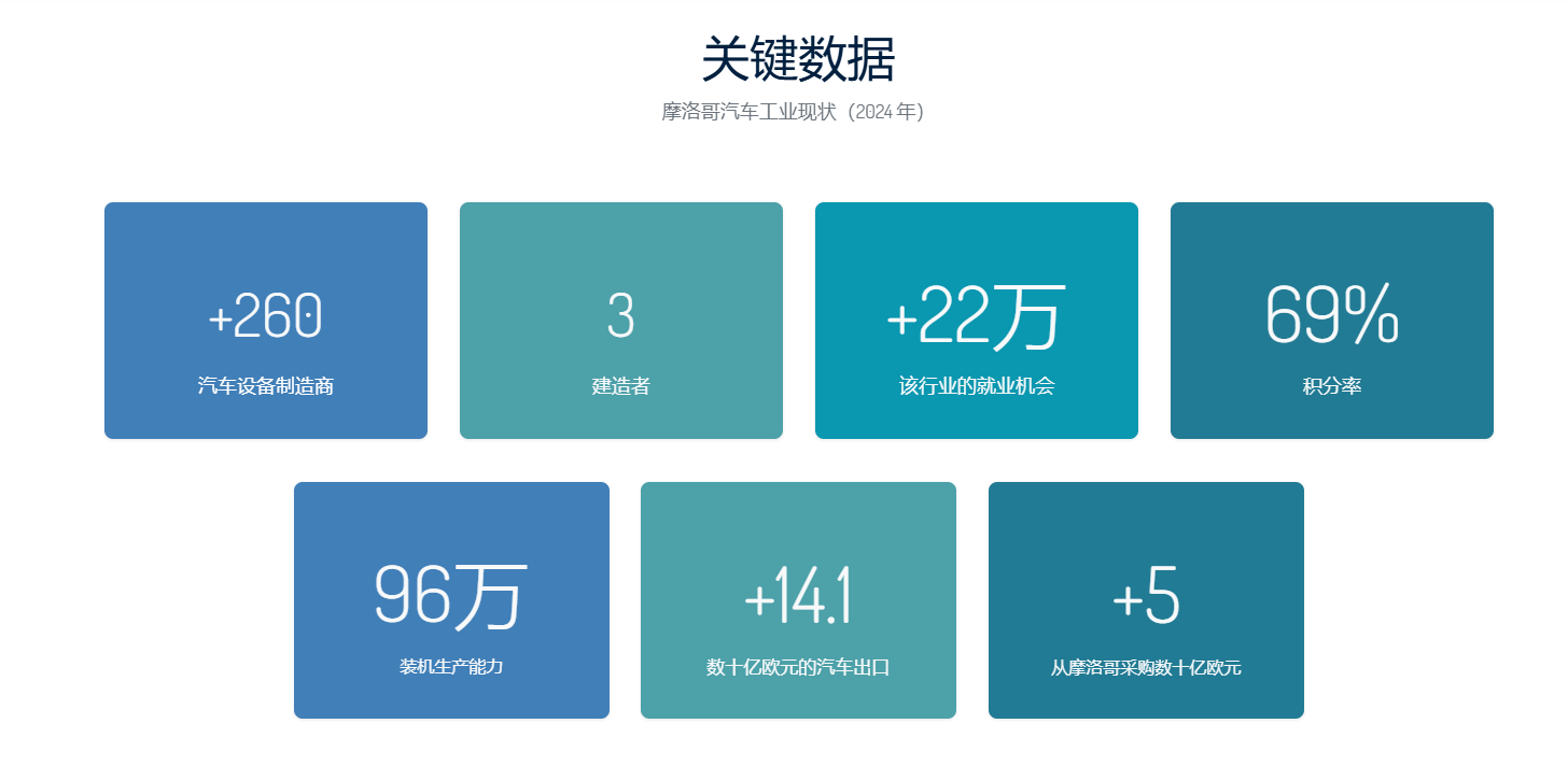 摩洛哥作為非洲最大的汽車制造國之一,近年來在新能源汽車領(lǐng)域也取得了顯著進(jìn)展。摩洛哥政府積極推動電動汽車和綠色技術(shù)的發(fā)展,并通過稅收優(yōu)惠、投資激勵等措施吸引國際汽車制造商。得益于摩洛哥擁有豐富的鈷、磷酸鹽和鋰等電池制造所需的礦產(chǎn)資源,尤其是磷酸鹽儲量占全球總儲量的75%位居首位,為新能源汽車的發(fā)展提供了堅(jiān)實(shí)的自然資源基礎(chǔ)。目前,摩洛哥已有超過260家公司從事車輛或零部件的生產(chǎn),汽車產(chǎn)業(yè)占國內(nèi)生產(chǎn)總值的22%,出口額高達(dá)129億歐元。
